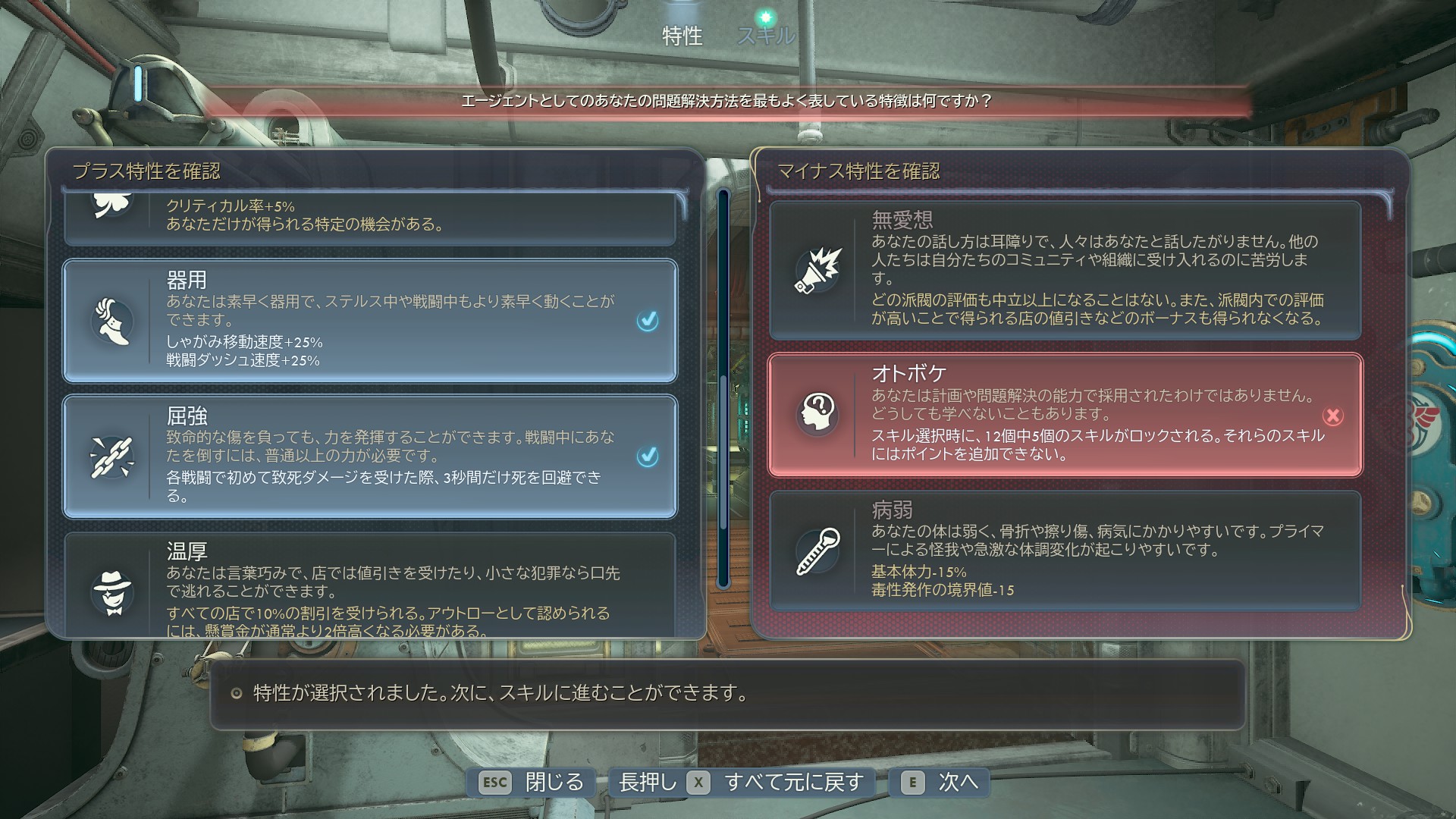2つ特性を選んだ際に発生するマイナス特性に関してはオトボケを選択しました。12個あるスキルのうち5個のスキルにポイントが振れなくなるというデメリットは一見大きいように感じますが、そもそもスキルポイントはカツカツなので何の支障もありません。