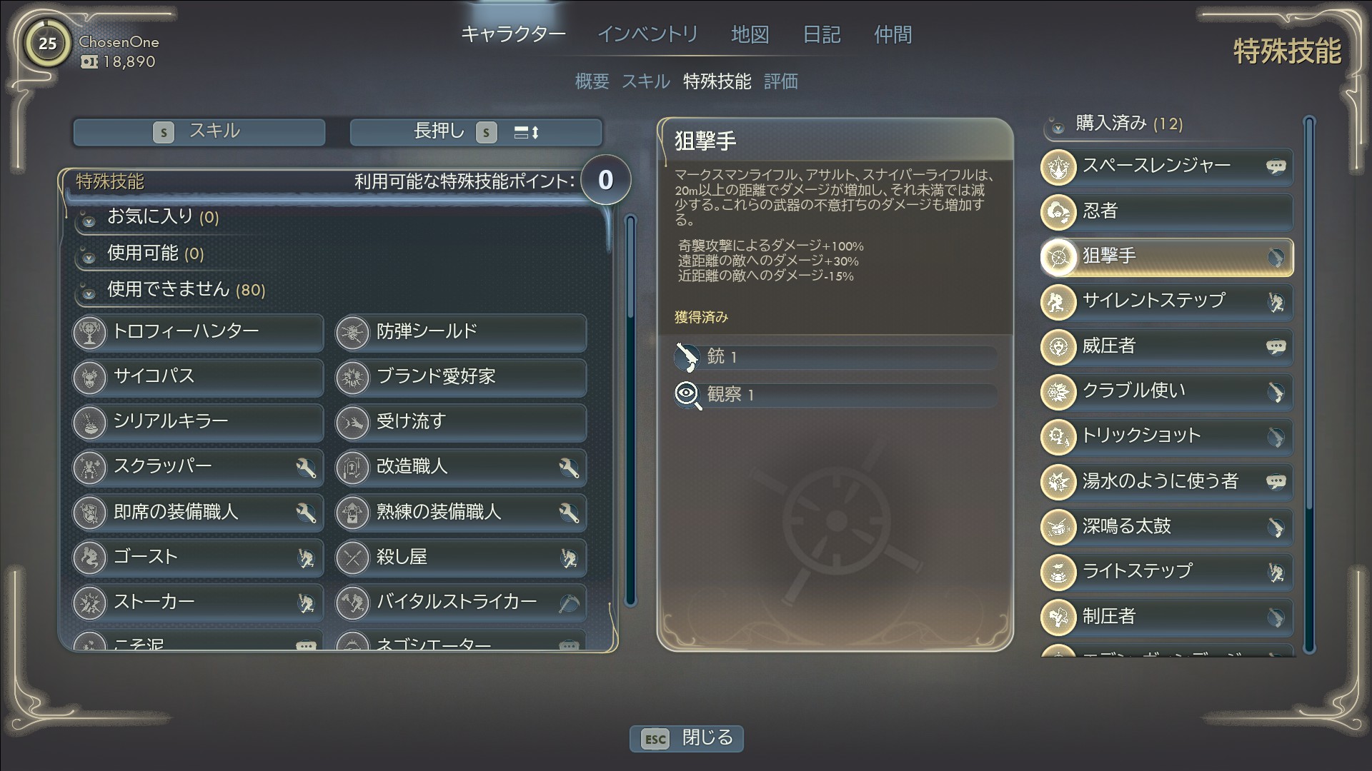 そこで奇襲攻撃の出番というわけです。スニーキング、特殊技能、装備品を組み合わせてダメージ倍率をガンガン上げることで強引に敵を処理していきましょう。最終的にヘッドショットで1撃2000以上出せるようになるので、スピーチ同様に最終的には20まで上げることを推奨です。