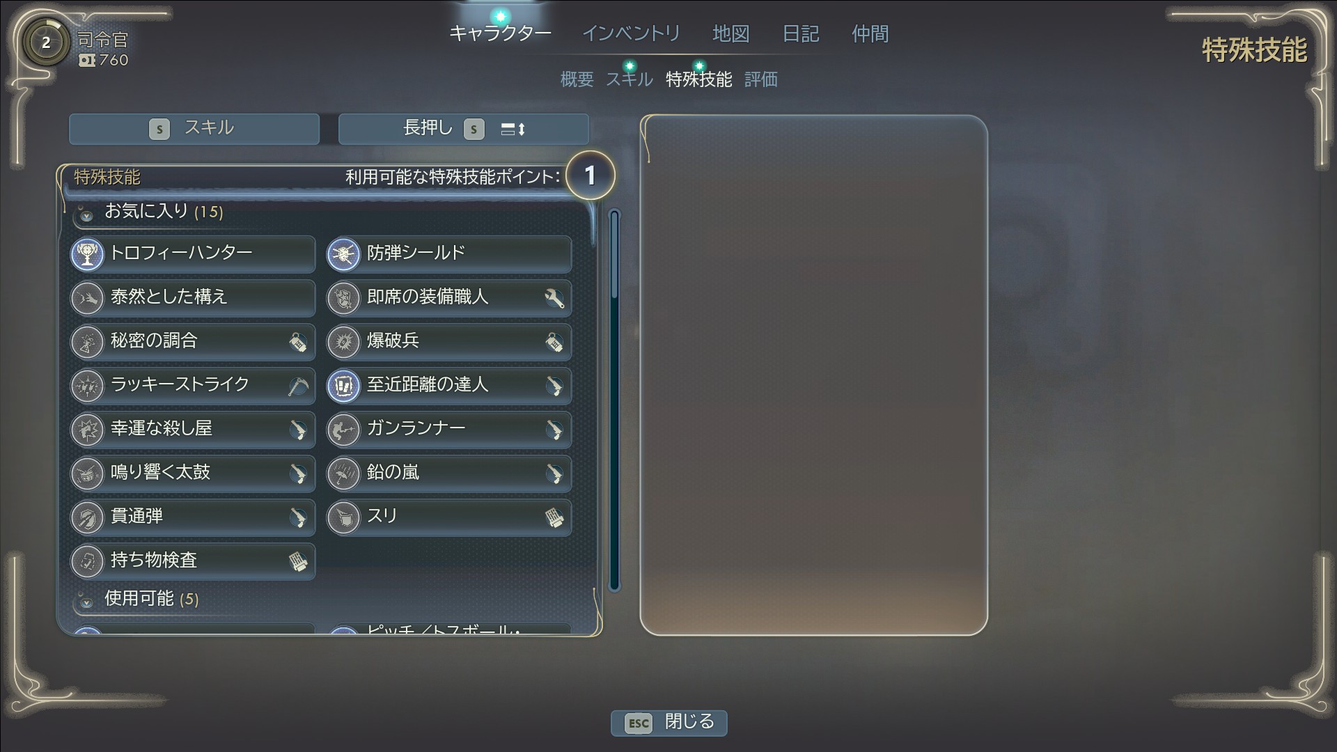 スキル振りについてですが、レベル2の錠ピック1とレベル9から10にかけてのエンジニアリング3以外は銃と爆薬に振ります。目安としては銃6くらいまでは銃を優先で、それ以降は爆薬メインに振るようにすると後々スムーズに特殊技能を習得できます。
